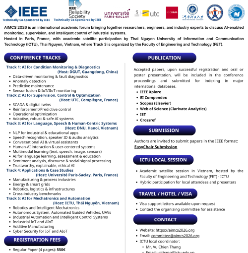 TRACK 5: AI for Mechatronics and Automation – TỔ CHỨC TẠI ICTU Khoa Kỹ thuật & Công nghệ – ICTU trân trọng thông báo tới các giảng viên, nhà nghiên cứu,... -