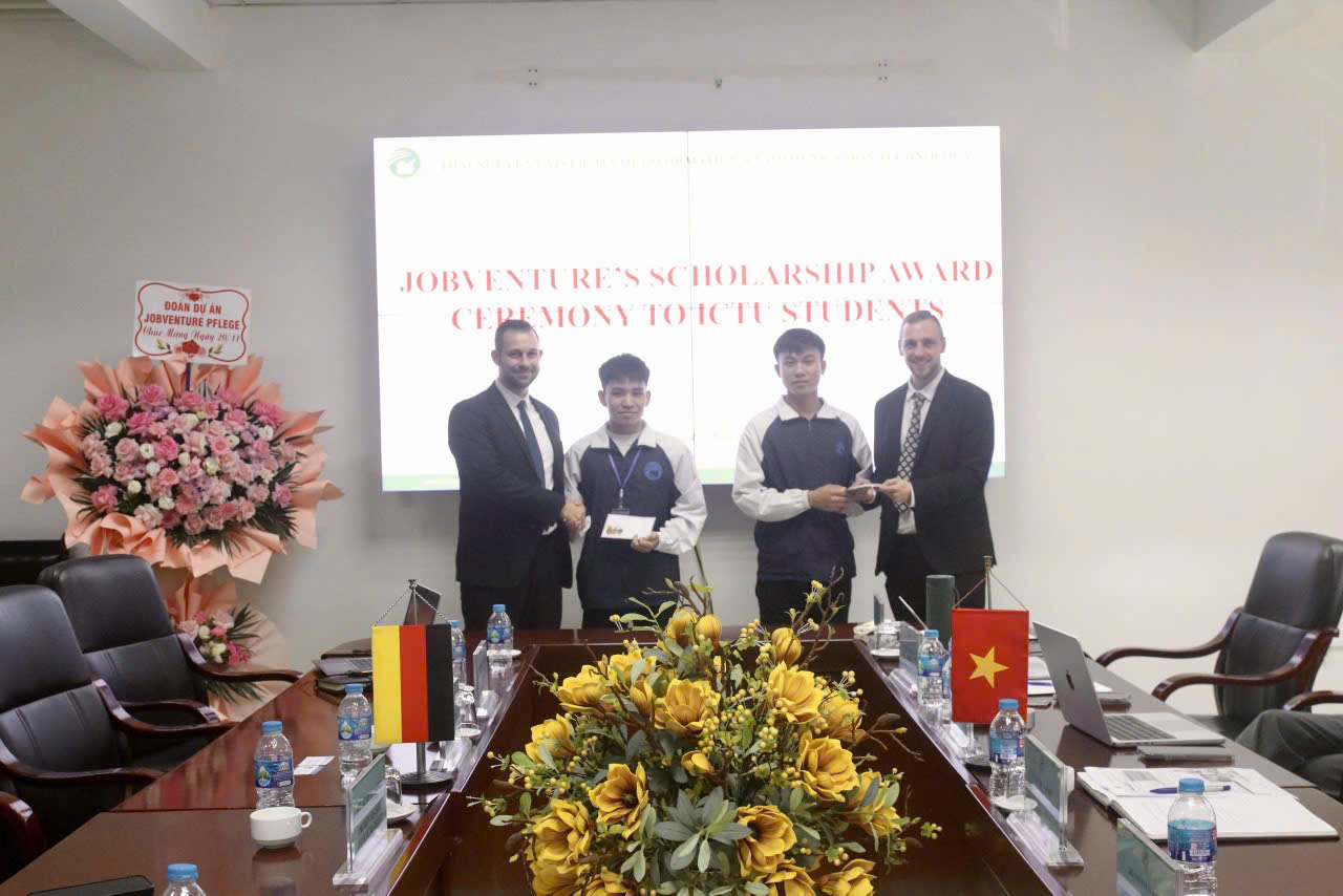 Cũng trong buổi làm việc ý nghĩa này, Đoàn JobVenture đã trao tặng 02 suất học bổng danh giá cho 02 sinh viên tiêu biểu của ngành Công nghệ ô tô và Tự động hóa, như một sự ghi nhận cho những nỗ lực và thành tích học tập xuất sắc của các em. Đây là nguồn động viên lớn, khẳng định tiềm năng và chất lượng sinh viên ICTU.