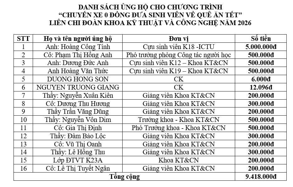 Sau thời gian phát động chương trình “Chuyến xe 0 đồng – Đưa sinh viên Khoa Kỹ thuật và Công nghệ về quê đón Tết Bính ngọ 2026”, BCH Liên chi đoàn Khoa đã nhận được sự quan tâm, chung tay ủng hộ quý báu từ các thầy cô giáo, các anh chị cựu sinh viên và các nhà hảo tâm với tổng kinh phí 9.418.000 đồng.